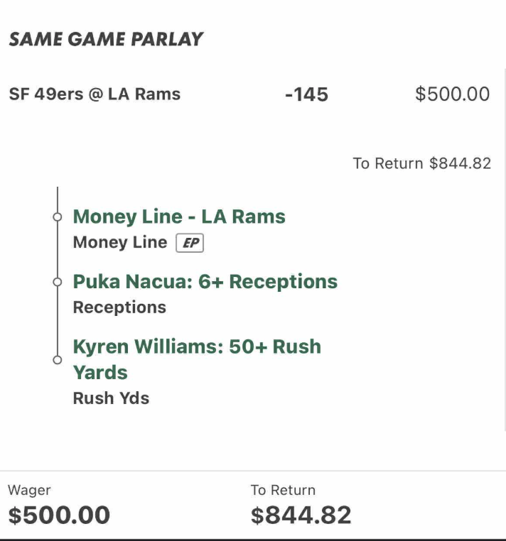The Rams’ formula is clear: feed Nacua through the air, let Williams handle the ground game, and trust Stafford to do his thing. Given San Francisco’s depleted defense, this parlay combines safety with value.